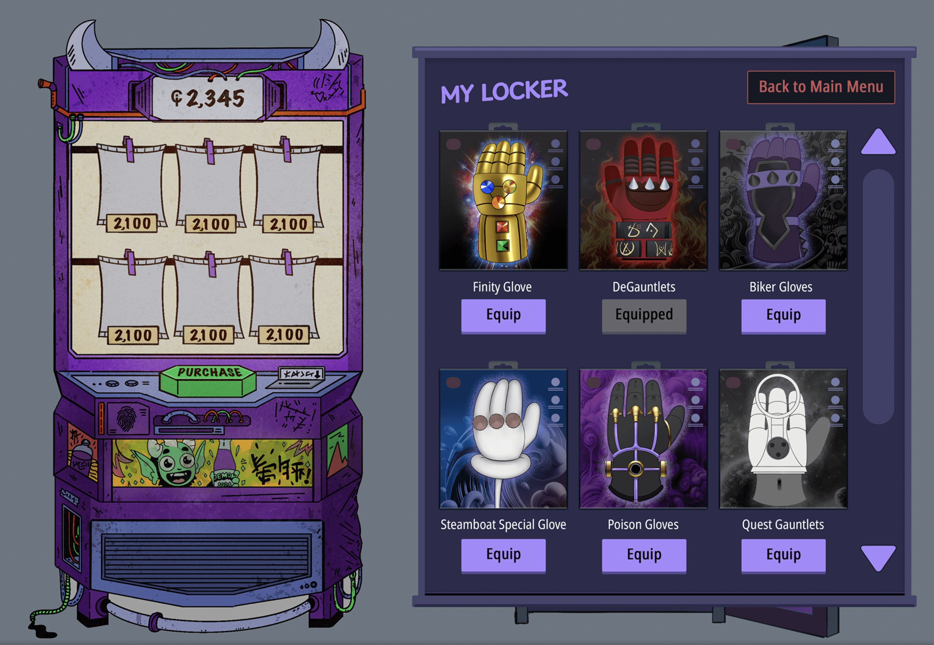 • UI/UX Design: Concept art and final creation for all UI/UX elements in the game, including menus, in-game indicators, tooltips, and various scenes such as the vending machine and locker room.